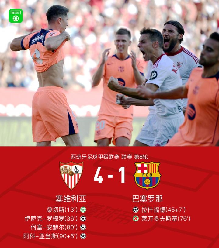 北京时间10月5日,西班牙足球甲级联赛第8轮激战正酣,塞维利亚坐镇主场迎战劲敌巴塞罗那。上半场风云突变,阿劳霍不慎送点,桑切斯冷静点射,洞穿旧主大门,随后伊萨克-罗梅罗禁区内机敏推射,再下一城,扩大领先优势。补时阶段,佩德里妙传助攻,拉什福德把握机会,攻入个人西甲生涯首球。下半场,贾努扎伊禁区内犯规,巴尔德应声倒地,裁判果断判罚点球,然而莱万主罚却遗憾偏出。紧接着,何塞-安赫尔禁区右侧精准低射,再次改写比分。补时尾声,阿科-亚当斯推射空门,锁定胜局。最终,巴萨以1-4不敌塞维利亚,遭遇联赛首场败绩。